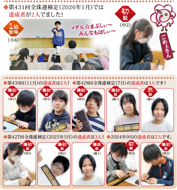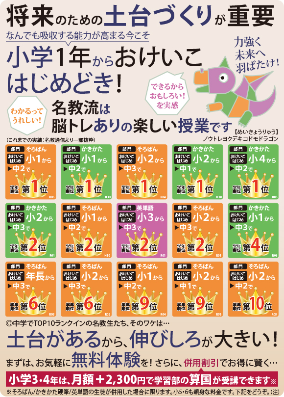 名教学院には様々な部門があり、「そろばん」「かきかた硬筆」といった、お稽古の性質をもったものもあります。それぞれの部門では、生徒の作品を展示する機会や、日頃の努力の成果を発揮する検定などが数多くあります。